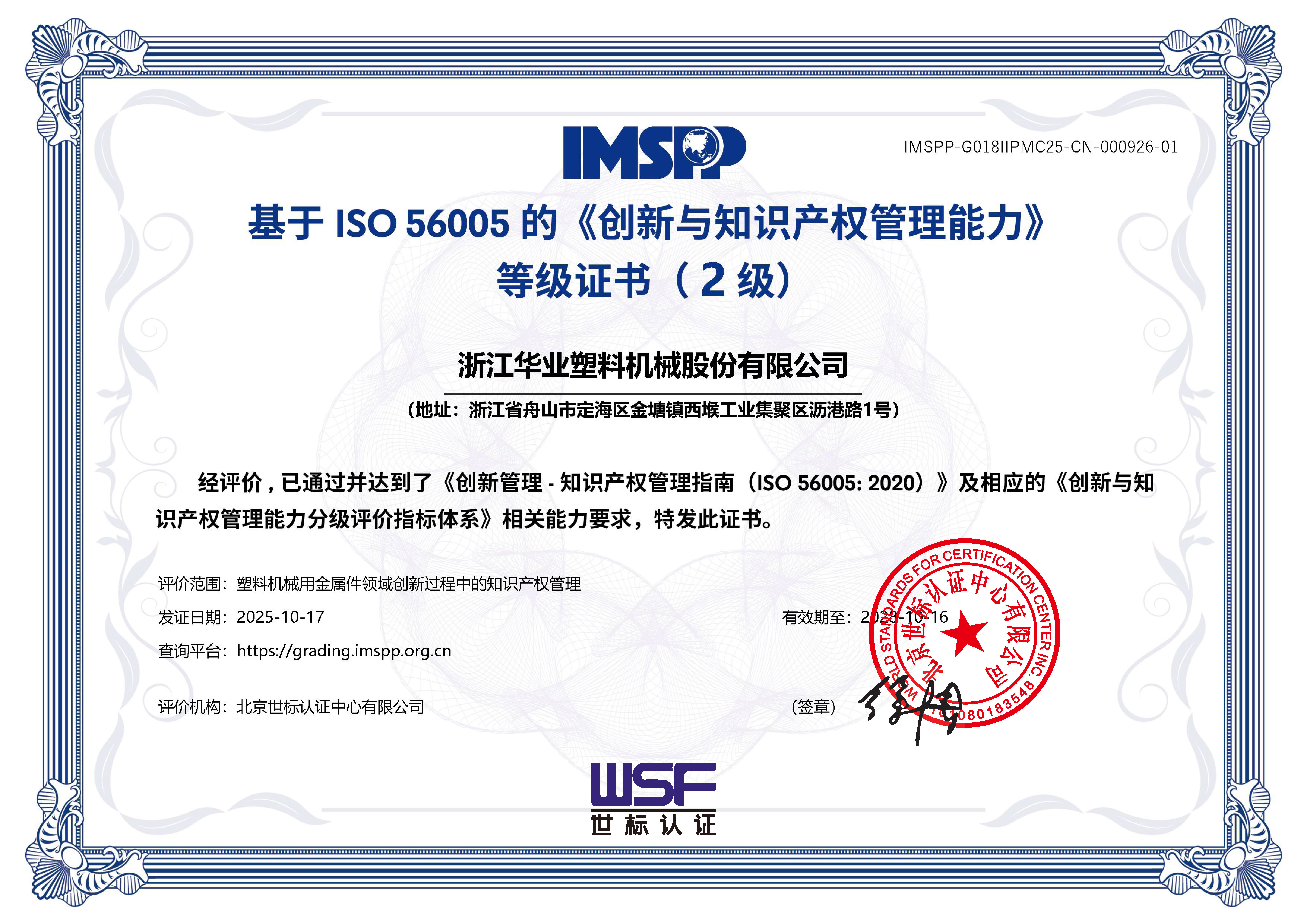 近日,浙江華業(yè)塑料機(jī)械股份有限公司(SZ.301616)榮獲ISO 56005的《創(chuàng)新與知識(shí)產(chǎn)權(quán)管理能力》等級(jí)證書…